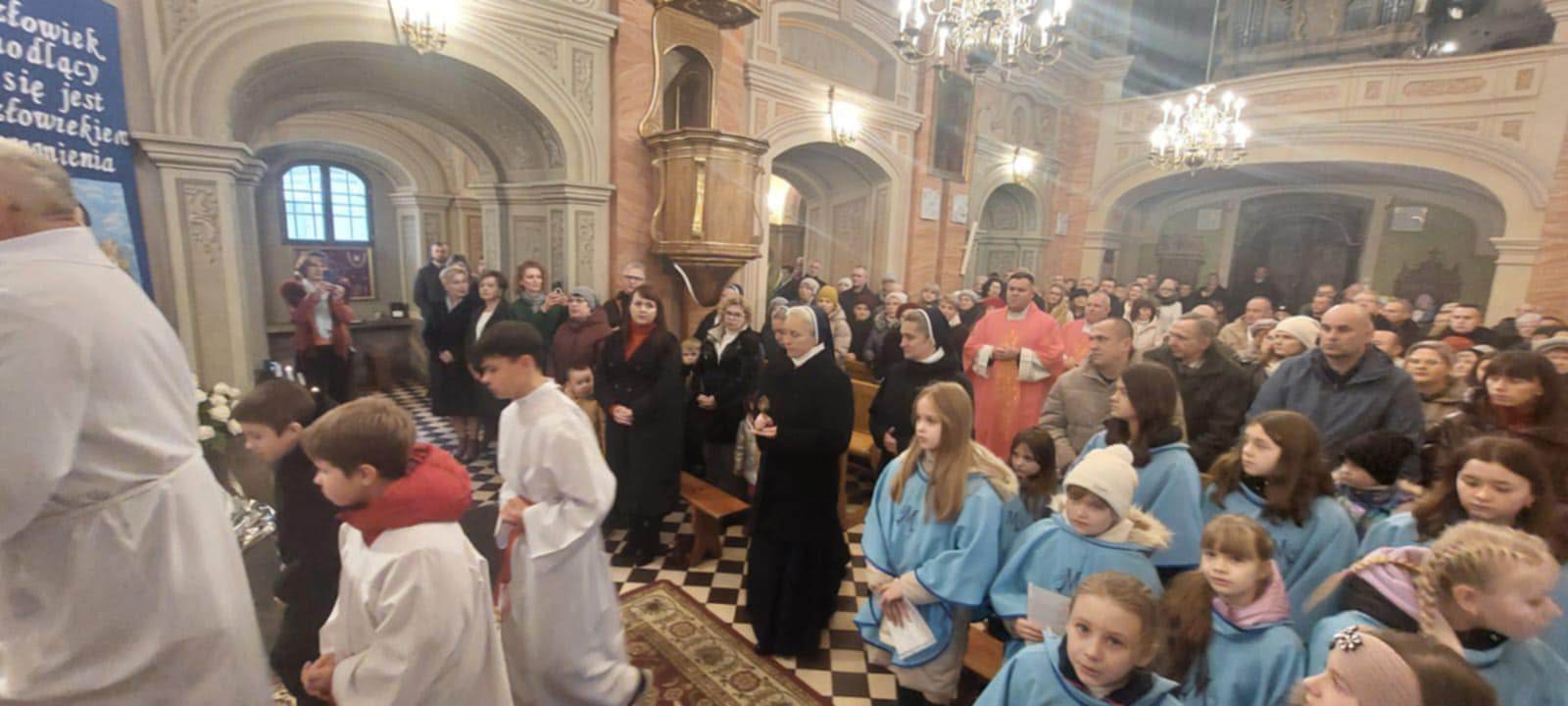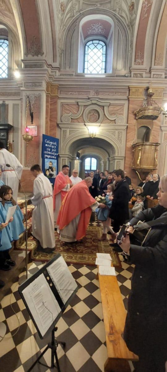 14 grudnia 2025, niedziela Radości-Gaudete. Dla naszej parafii Świętego Mikołaja Biskupa w Szewnie to dzień szczególny. Dziś nasza parafia przyjęła z rąk Matki Generalnej  Zgromadzenia Sióstr Służebniczek Bogarodzicy Dziewicy Niepokalanie Poczętej – Siostry Małgorzaty Kaput relikwie błogosławionego Edmunda Bojanowskiego. Uroczystość miała miejsce podczas Mszy świętej o godzinie 11:30. W czasie uroczystej procesji na wejście siostry: Matka Generalna Małgorzata Kaput, Siostra Prowincjalna Urszula Kowal, Siostra Fidelisa Kogut oraz Siostra Agnieszka Jurek, która przez wiele lat była częścią naszej wspólnoty wniosły uroczyście do naszej świątyni relikwie. Matka Generalna złożyła relikwie w miejscu przygotowanym przy dekoracji przedstawiającej bł. Edmunda w otoczeniu dzieci, a w tym czasie wierni śpiewali pieśni o bł. Edmundzie.