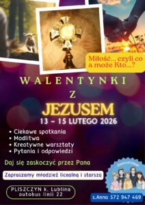 Walentynki z Jezusem w Pliszczynie koło Lublina– spotkanie dla młodzieży od  szkół średnich, studentów i młodzież pracującą. Zapraszamy także młodzież z klasy 8 szkoły podstawowej. Zgłoszenia s. Anna Gruszewska  tel. 572 947 469