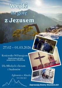 Wyjazd w góry (rekolekcje w górach) „Wejdź na górę z Jezusem” w Krościenku nad Dunajcem dla młodzieży szkół średnich, studentów i dla młodzieży pracującej. Zapraszamy także młodzież z klasy 8 szkoły podstawowej. Zgłoszenia s. Klaudia Sochocka tel. 515 284 863