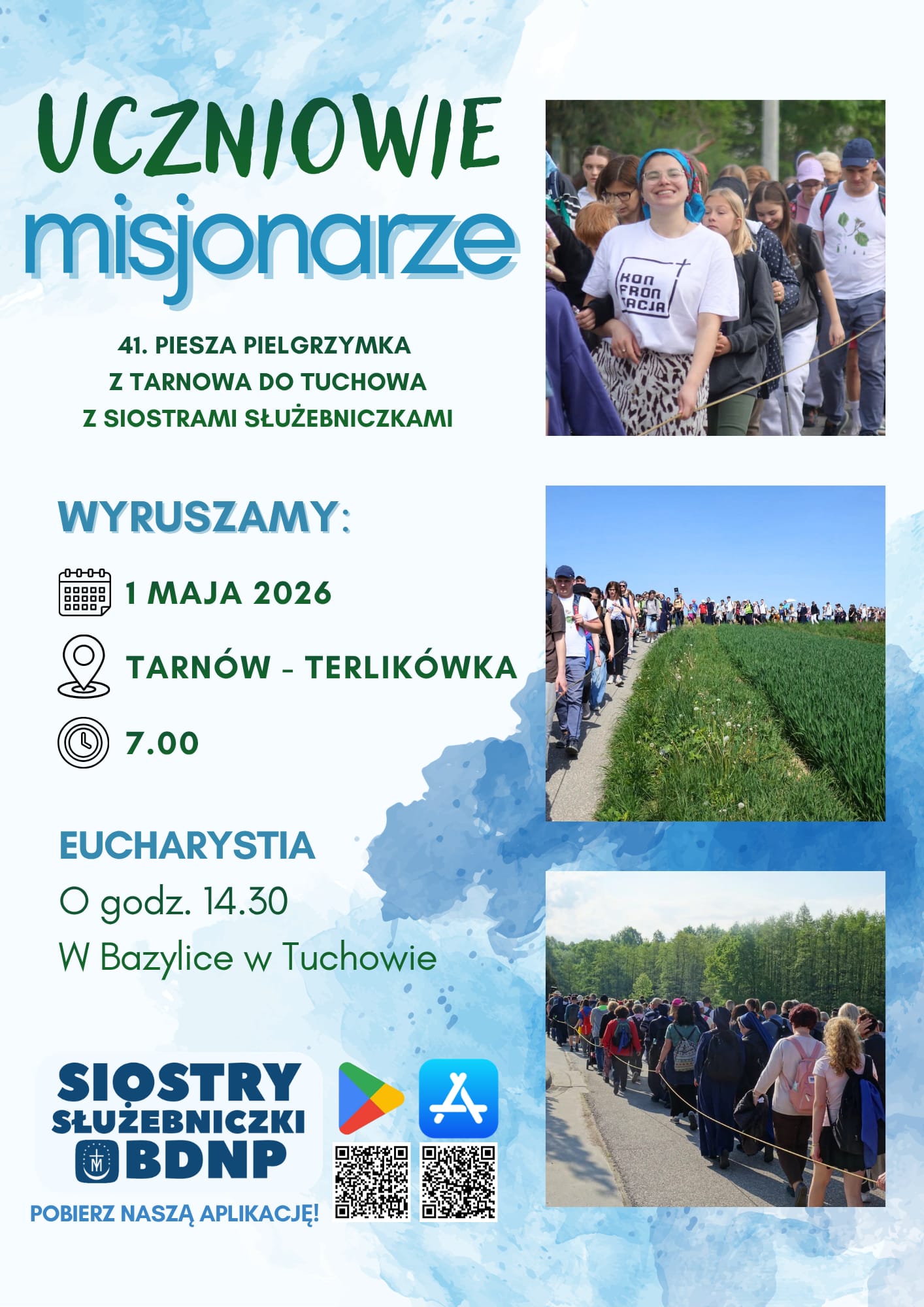 Serdecznie zapraszamy wszystkich – dzieci, młodzież i dorosłych – do udziału w 41. Pieszej Pielgrzymce z Tarnowa do Tuchowa z Siostrami Służebniczkami BDNP, która w tym roku odbędzie się pod hasłem „Uczniowie – misjonarze”.