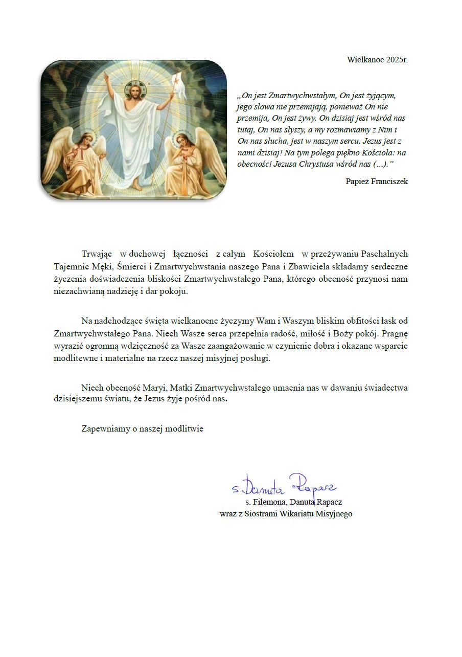 „On jest Zmartwychwstałym, On jest żyjącym, jego słowa nie przemijają, ponieważ On nie przemija, On jest żywy. On dzisiaj jest wśród nas tutaj, On nas słyszy, a my rozmawiamy z Nim i On nas słucha, jest w naszym sercu. Jezus jest z nami dzisiaj! Na tym polega piękno Kościoła: na obecności Jezusa Chrystusa wśród nas (…).”